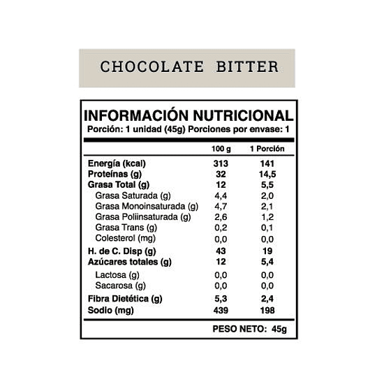 Crisp de soya 22% (aislado de proteína de soya, cacao, almidón de tapioca), dátiles, maltitol, chocolate 15% (cacao en pasta, maltitol, polidextrosa, lecitina de soya, polirricinoleato de poliglicerol, SUCRALOSA (11,3mg/100g - 5,3mg/porción - IDA 0-15 mg/kg de peso corporal), saborizante idéntico al natural), aislado de proteína de arvejas 13%, maní, saborizante idéntico al natural.